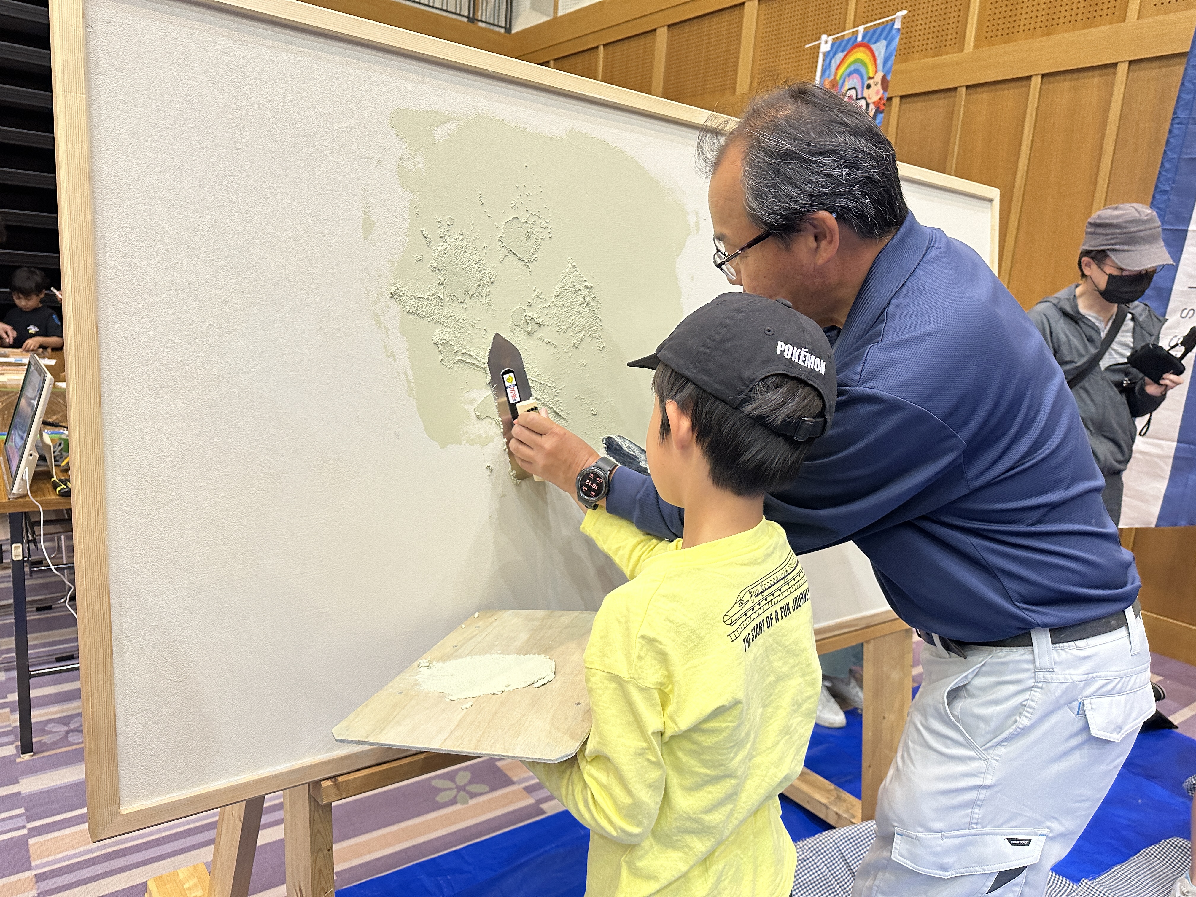 「左官体験」では、実際の仕上げ材と、コテを使って壁に塗る作業を体験してもらいました。