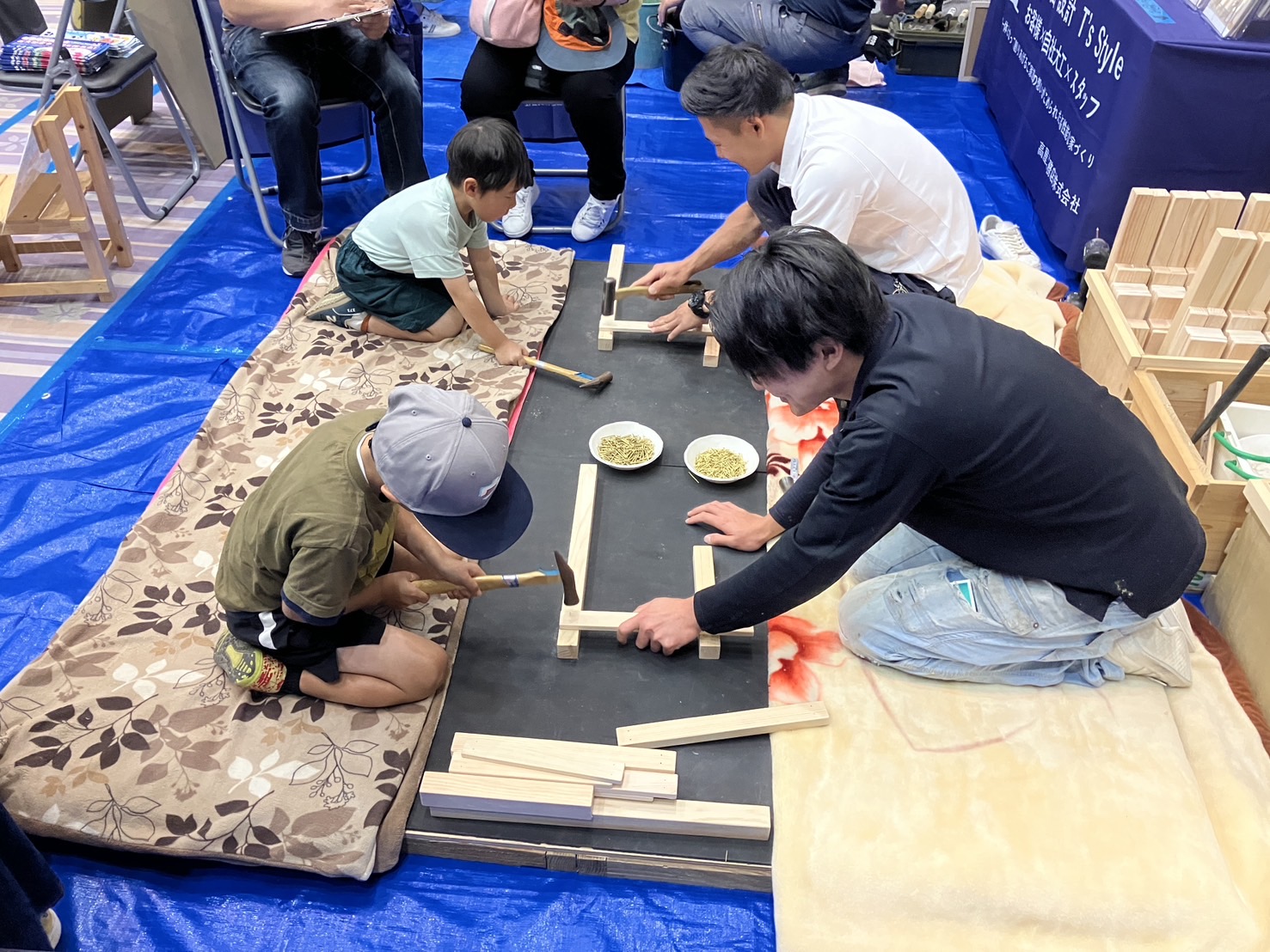 高屋工務店のブースでは、メイン体験として「椅子づくり体験」と「左官体験」を実施🔨