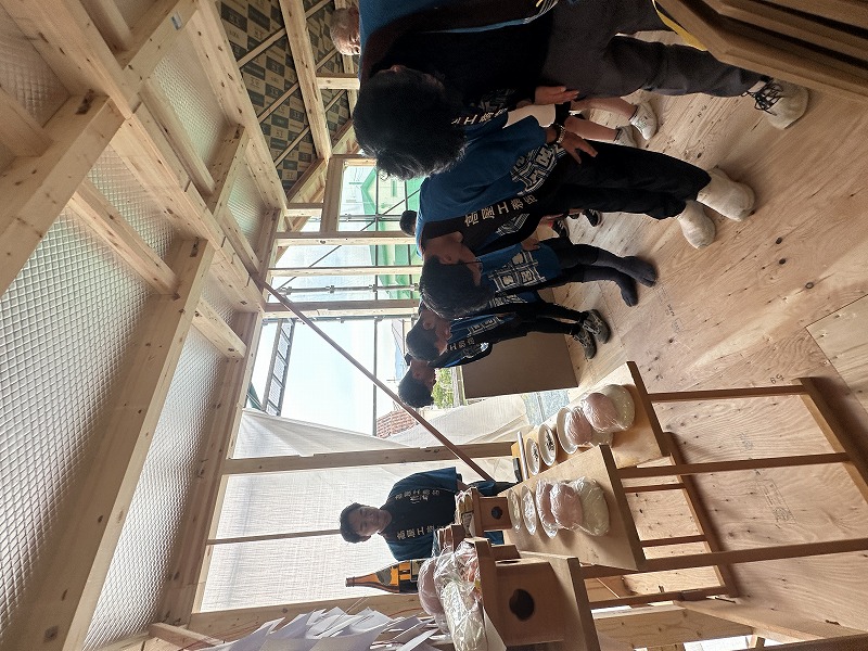 上棟式では、主要な柱や構造材をお客様ご自身の手で立てていただくという体験を取り入れています。棟梁や職人のサポートのもと、ご家族全員で「この家は、自分たちが中心となって建てているんだ」という実感を抱く瞬間です。