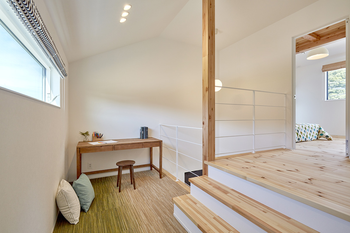 完全な個室を設ける余裕がない場合でも、2階のホールにカウンターデスクを設置すれば、簡易的なワークスペースとして活用できます。