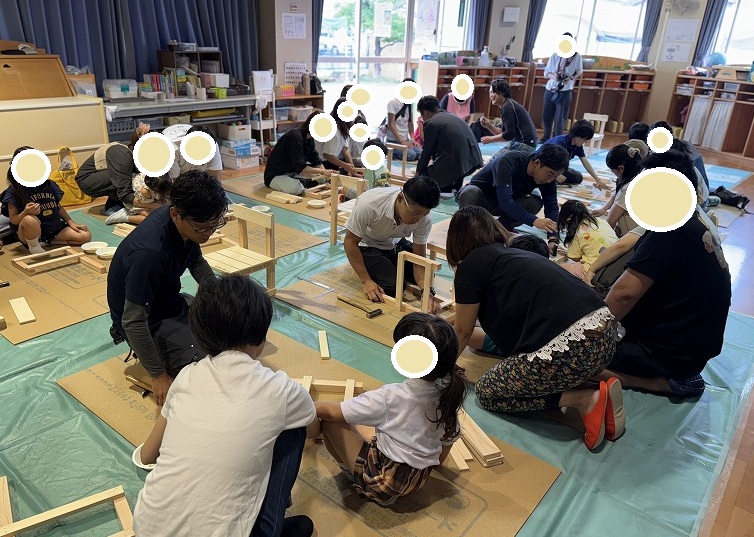 最初はちょっと緊張していた子どもたちも、木のパーツを組み立て始めると目を輝かせて夢中に✨お父さん・お母さんと一緒に「ここを押さえて!」「釘はここだよ!」と声をかけ合いながら作業する姿は、とても微笑ましいものでした。手触りや木の香りを感じながら、自分の手で椅子を完成させる達成感は、きっと特別な体験になったと思います。