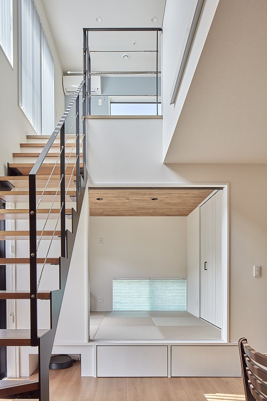 階段の途中に設けたスキップフロアから、玄関の吹き抜け空間を見渡せるようにした間取り。お子様のスタディスペースや読書コーナーとして活用できるスキップフロアは、こもり感がありながらも、家族の気配を感じられるちょうど良い距離感が魅力です✨