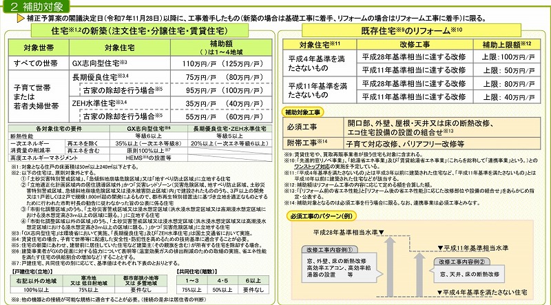 ZEH水準住宅と長期優良住宅は子育て世帯または若者夫婦世帯が対象ですが、GX志向型住宅はすべての世帯が対象です。
