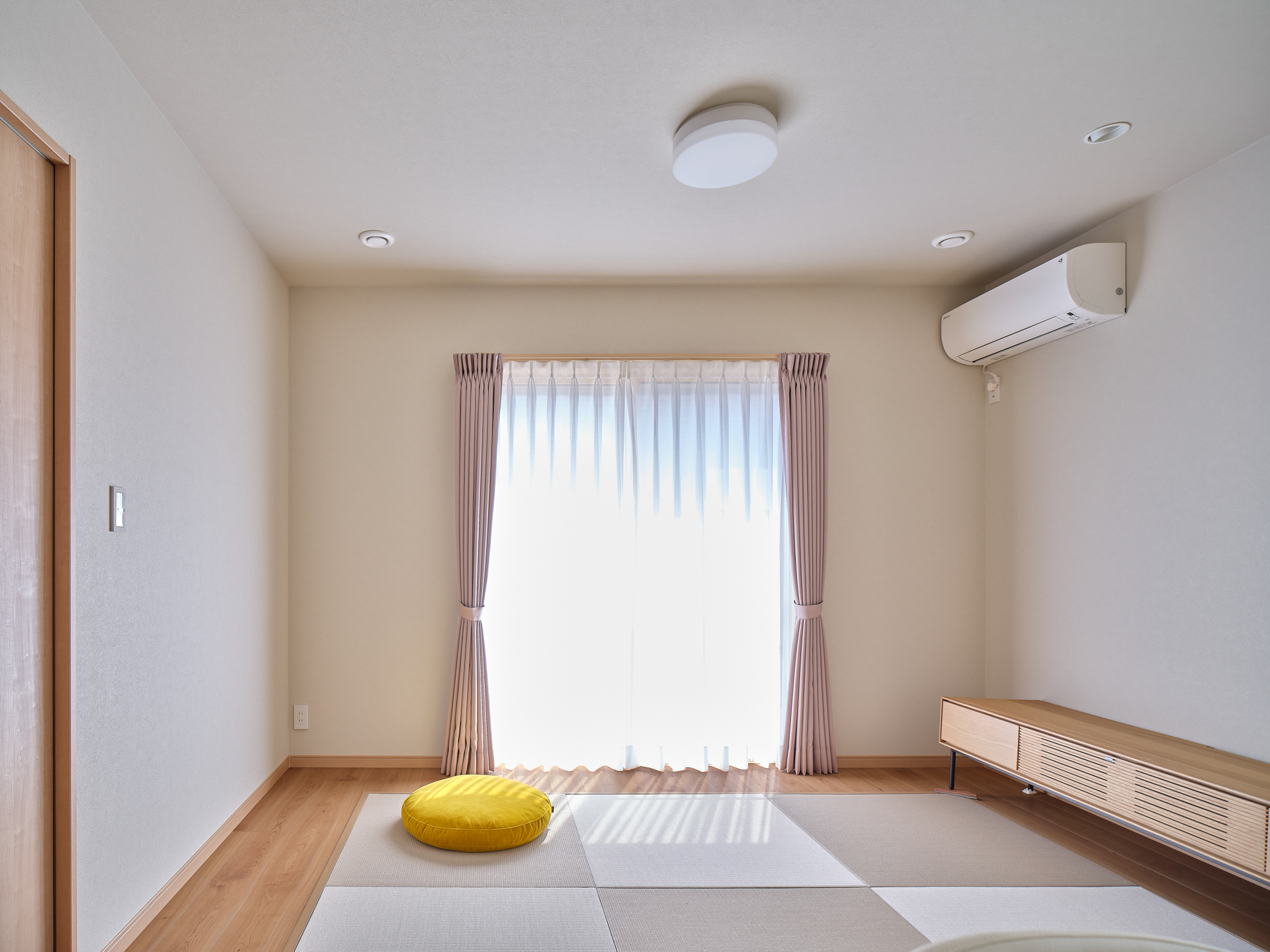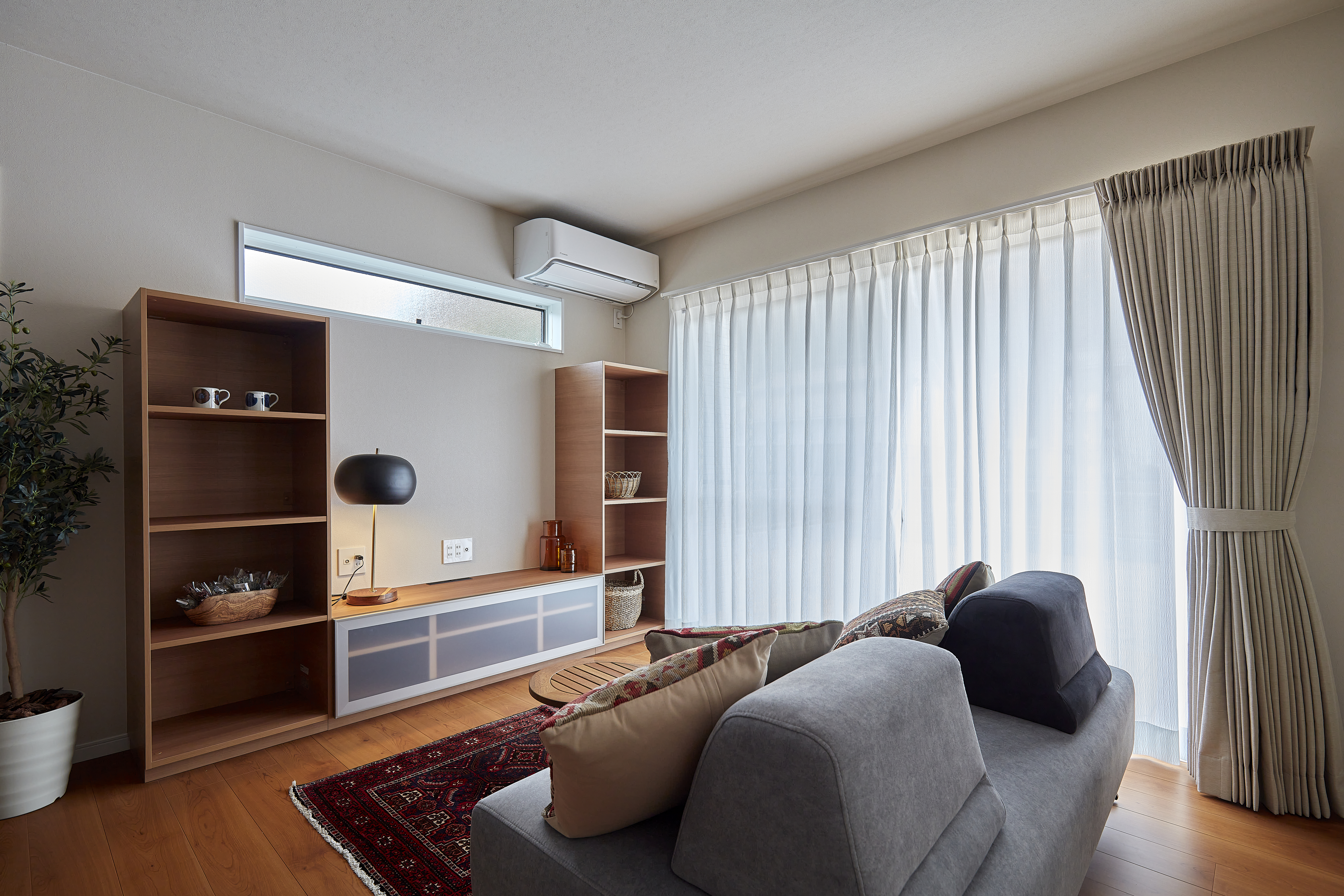 壁の色に近いカーテンを選ぶことで、空間に一体感が生まれ、広くスッキリと見せる効果があります👍