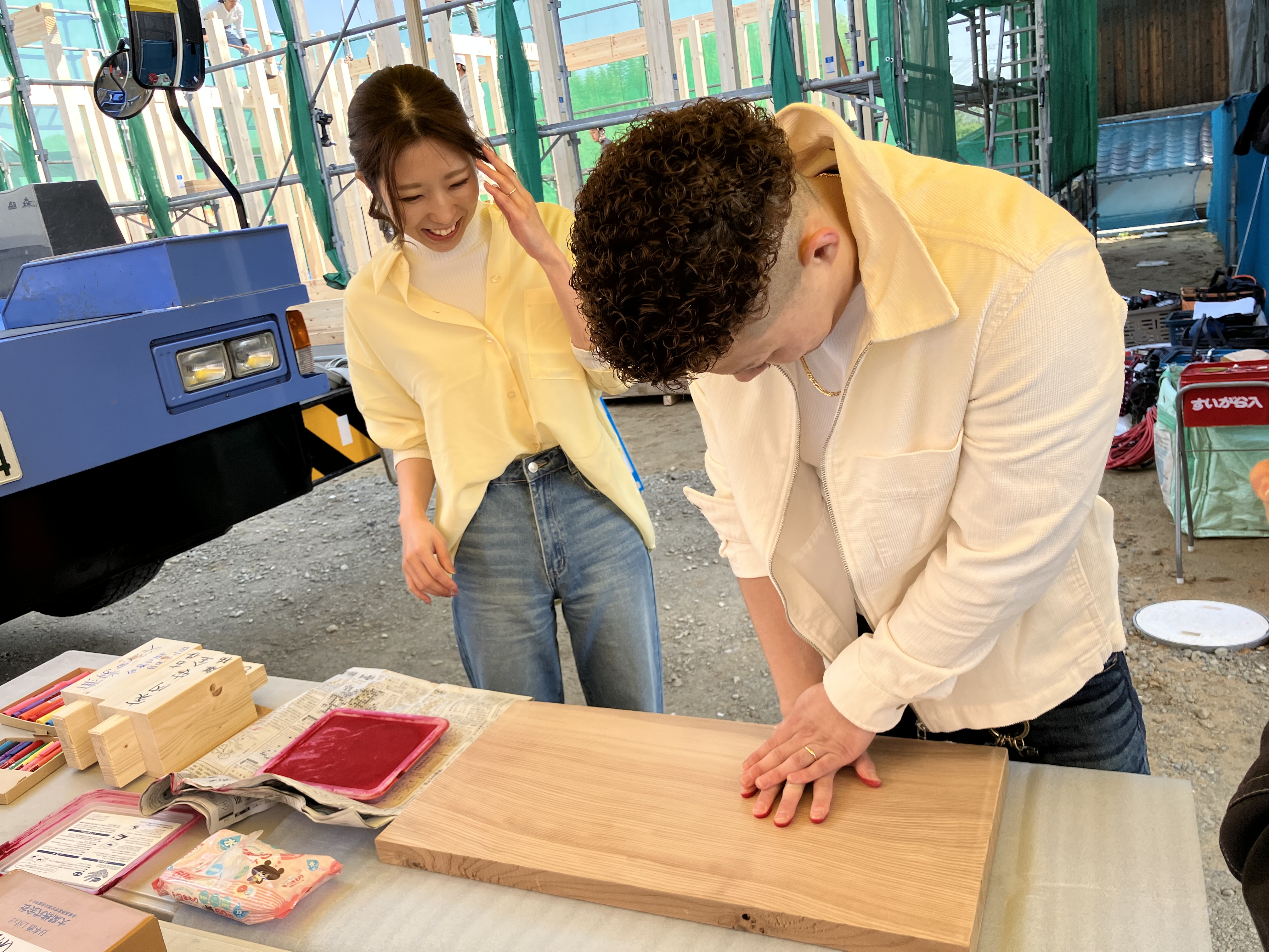 上棟式では、記念に「手形板づくり」を行いました。